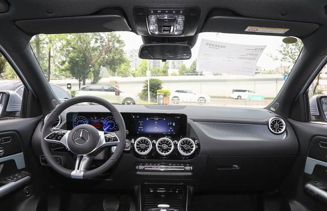 进入车内,10.25英寸双联屏设计(仪表盘+中控屏)搭载最新MBUX智能交互系统,支持触控、语音和手势控制。中控台采用仿皮材质包裹,搭配钢琴烤漆面板和镀铬饰条,触感与视觉效果兼具。64色环境氛围灯配合发光星徽饰板,营造出豪华的驾乘氛围。座椅方面,全系标配仿皮座椅,可选运动风格座椅,提供前排电动调节和加热功能,但通风和按摩功能需选装。后排座椅填充物偏硬,且地台中央隆起较高,对中间乘客的舒适性有一定影响。